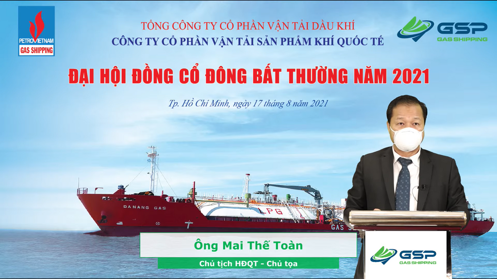 Sáng ngày 17/08/2021, Công ty Cổ phần Vận tải Sản phẩm khí Quốc tế đã tổ chức Đại hội đồng cổ đông bất thường năm 2021 bằng hình thức Đại hội trực tuyến. Tổng số cổ phần của các Cổ đông tham dự Đại hội trực tuyến tại thời điểm khai mạc Đại hội là 27.029.848 cổ phần, tương đương 75,08% cổ phần có quyền biểu quyết theo danh sách cổ đông chốt ngày 06/07/2021 do Trung tâm lưu ký chứng khoán Việt Nam (VSD) thực hiện.